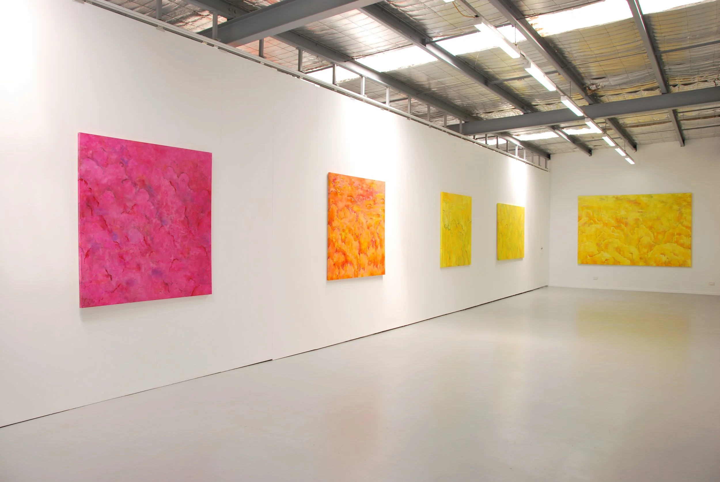The Australian landscape has always been a source of inspiration for Allman, who spent a number of years exploring both rural and outback Australia piloting Cessna aircrafts and hiking on foot. This new series of work is painted from memory, capturing the alluring beauty and serenity of the landscape and blurring the perspective of sky and ground. Through these works Allman recalls the intensity of the landscape grabbing her by the throat, searing the flesh and eyes – “to breathe was to burn”. Each work is saturated in a vibrant veil, an embodiment of the harsh effects extreme heat and blinding glare has on the mind, body and psyche. Navigating these environments is an all encapsulating full body experience, your mind wanders and your body burns.